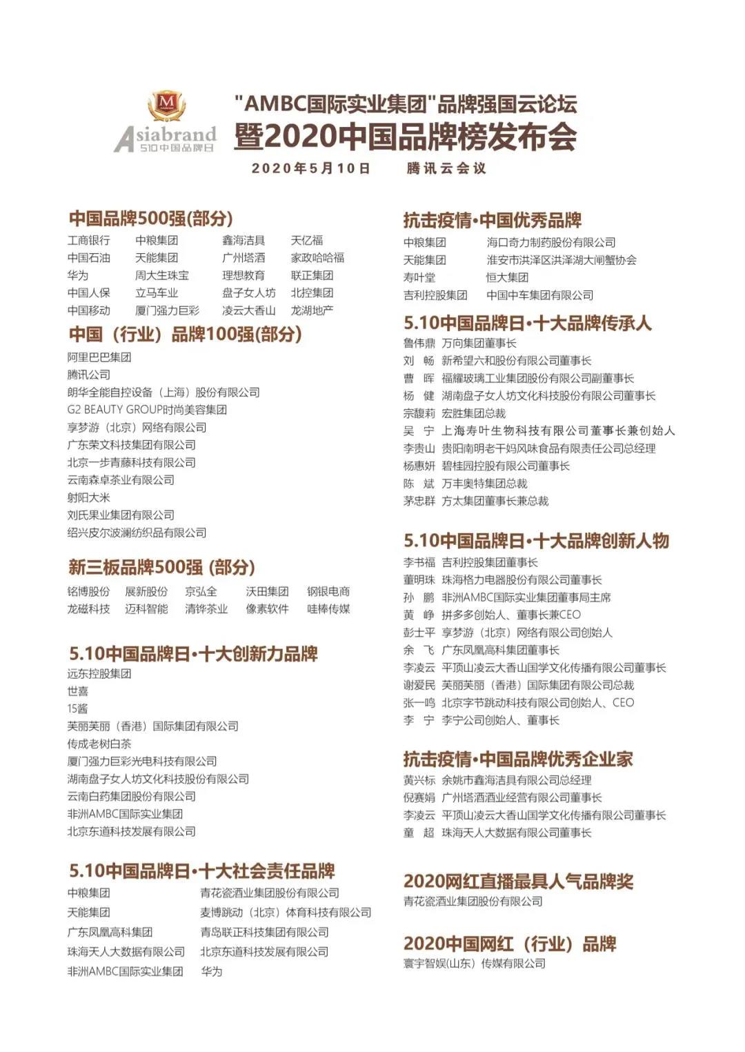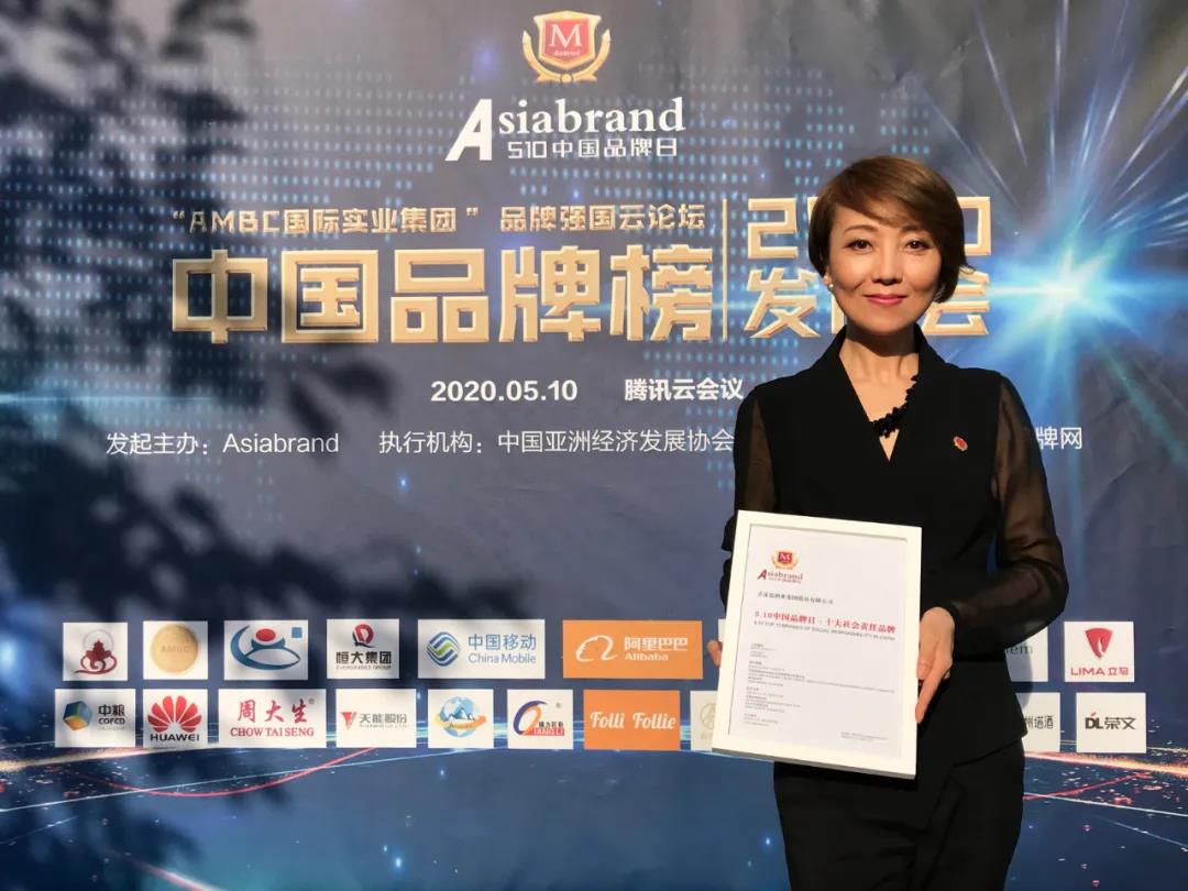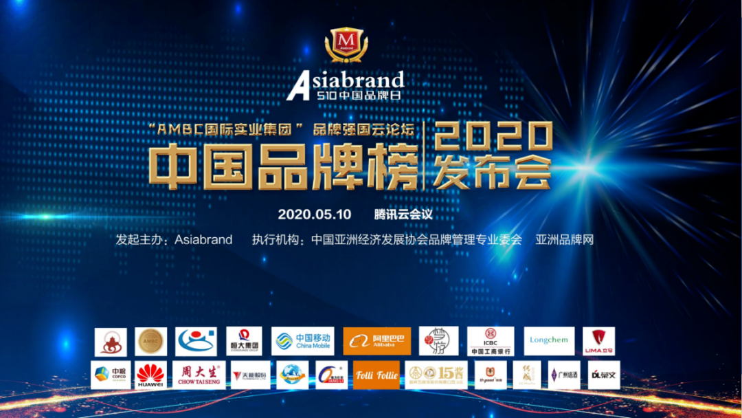 2020年5月10日,为积极贯彻落实国家提出设立“中国品牌日”的指示精神,实施品牌强国战略,通过加强品牌建设提升企业抗“疫”力,助力中国企业疫后重振,全力以赴促进中国经济全面复苏和高质量发展,由专业品牌评价机构Asiabrand发起主办,中国亚洲经济发展协会品牌管理专业委员会和亚洲品牌网联合主办的“AMBC国际实业集团”品牌强国云论坛暨中国品牌榜发布会通过网络直播形式隆重举行。