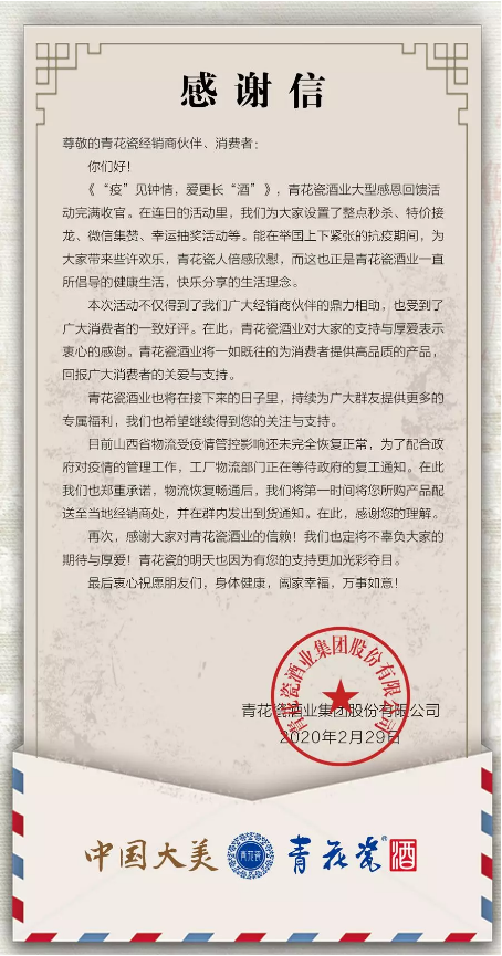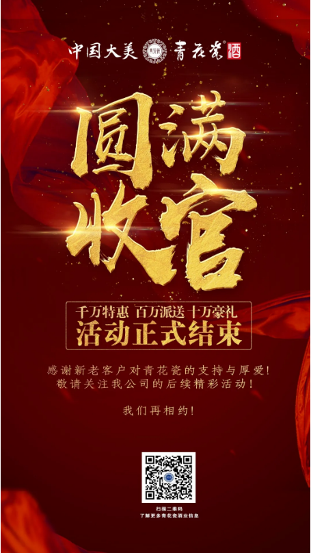 为期11天的百群联动线上回馈活动,截止到2020年2月28日圆满收官!疫情期间,青花瓷酒业集团感谢新老客户长期以来对我们的信任与支持,在疫情期间特推出“疫”见钟情,爱更长“酒”的百群联动活动,并为群内新老客户奉上“十万豪礼,百万派送,千万回馈”的专属福利,让我们全国消费者在家也能感受到来自青花瓷的温情与关心!