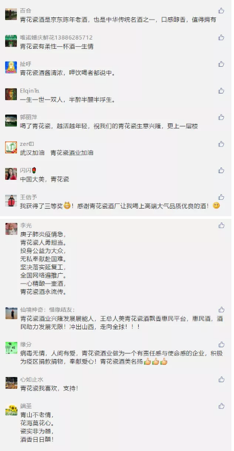 通过这次的活动,更加深了我们青花瓷与广大消费者的感情,也感受到了新老顾客对于我们产品的认可与热爱,在参与活动的同时,也在我们官方平台留下了他们相对青花瓷说的话。