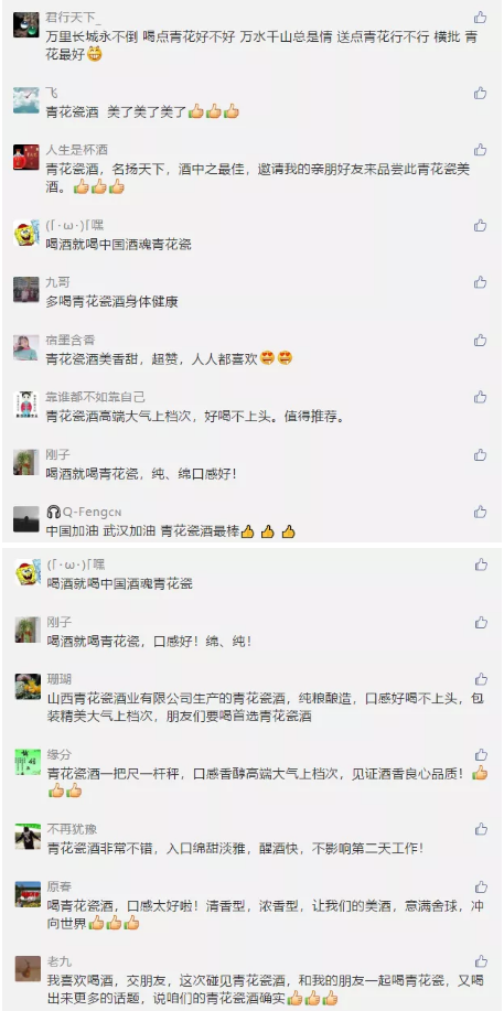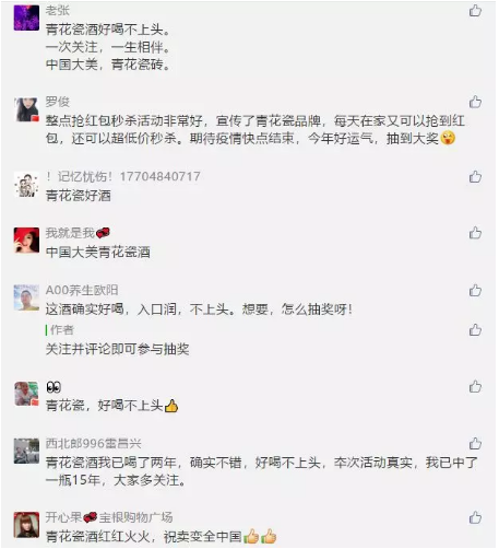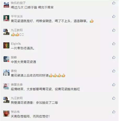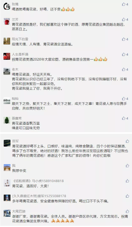 本次活动期间,青花瓷的酒友们留言满满,每天都有上千条评论,没办法一一展示给大家,随机截取部分留言来分享,让大家感受下来自青花瓷酒友的热情。虽然本次百群联动活动已经截止,但是我们青花瓷对全国消费者朋友的关心不会停止,青花瓷酒业集团专注品牌18年,匠心传承酿造佳品,经公司领导慎重研究决定,每月“18日”为青花瓷品牌日,我们每月不定期为青花瓷酒爱好者们推出更多精彩活动,没有参与本次活动的青花瓷酒爱好者也可联系本地经销商进入青花瓷酒VIP专享福利群,已经在群内的朋友要持续关注我们为大家奉上的专属福利活动哦!